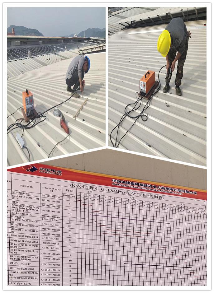 福建省永安恒晖4.6MW梯形彩钢瓦光伏项目,项目设计与施工单位经过多次与我司沟通,采纳了我司的方案,摒弃传统打孔安装方式;选用我司bb21螺柱焊机焊接彩钢瓦的方案,彻底解决了梯形彩钢瓦渗漏水痛点问题。项目顺利完工,交付业主,各方无忧!
